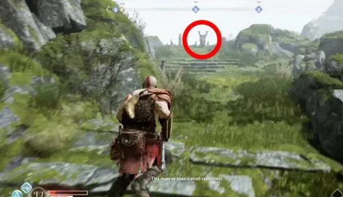 Первое святилище находится относительно недалеко от вашего текущего местоположения. Стоя спиной к алтарю, пройдите направо. Здесь вы увидите две тропинки, одна из которых ведет направо вверх по ступенькам, а другая — налево по краю обрыва. Следуйте по второму пути и вскоре вы достигнете первого святилища. Вы поймете, что находитесь в правильном месте, когда увидите перед собой молящегося Драуга. Убейте всех врагов и разрушьте правильную конструкцию.