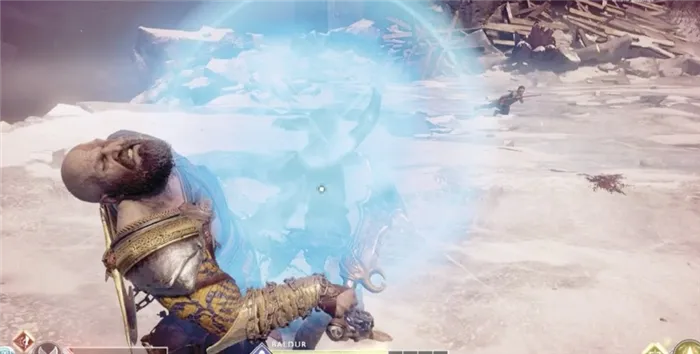 Фрейя (в роли Тамура) бросает путников в замерзшее озеро. Кратос и Атреус стоят спина к спине, ожидая, когда Балдур начнет действовать. Используйте левый стик, чтобы вращать пару и направлять Кратоса и его щит на фиолетовый указатель на экране, чтобы указать, где находится балдур. Вскоре Атреус видит своего врага, и Кратос уклоняется от атаки. Когда здоровье Балдура уменьшается, он исцеляет себя сам. Атака продолжается до тех пор, пока эта фаза боя не закончится.