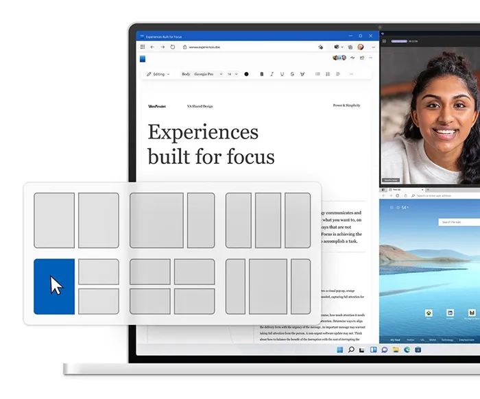 - Snap Layout — эффективное совместное использование экрана с оптимизированным расположением окон приложений. Кроме того, Microsoft заявляет, что Windows 11 — это операционная система для современных многочисленных окон.