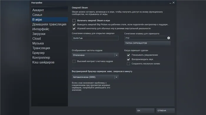 Поэтому все оверлеи должны быть отключены. Почти всегда это можно сделать в настройках программы, не удаляя ее. Наложение Steam, например, можно легко отключить через меню:
